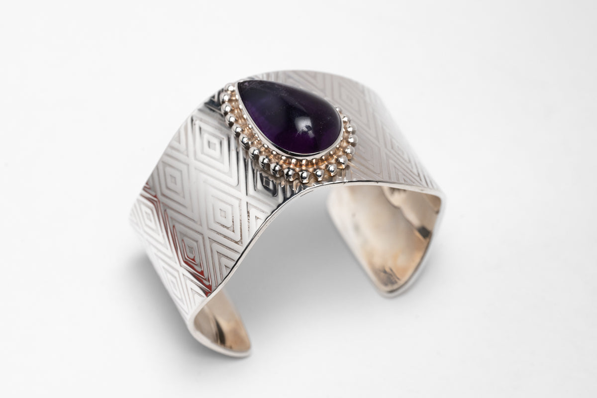 This handcrafted silver cuff by Navajo artist Benson Manygoats, who was born and raised in Tohatchi, New Mexico, displays the bold elegance of true Navajo silversmith work. Featuring a rich, polished Sugilite gemstone set at the center, this bracelet’s wide silver band is enhanced with intricate diamond-shaped stamp work that catches the light with every movement. The striking contrast between the deep purple sugilite stone and the reflective, hand-stamped sterling silver makes this cuff a true statement piece - perfect for those who want their jewelry to speak with confidence.